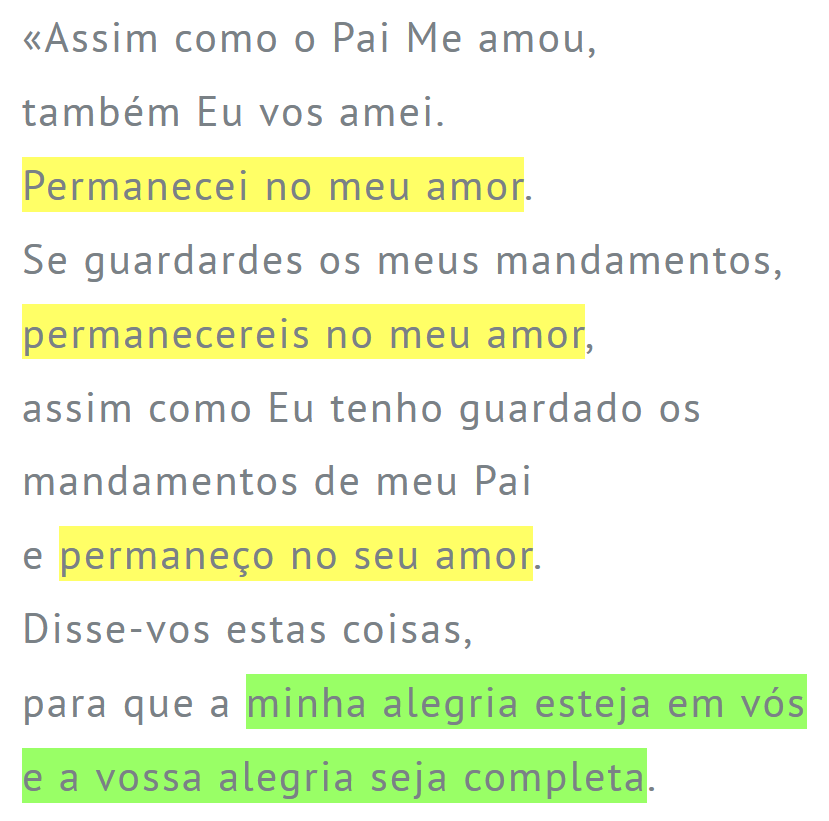 Escutar a tripla repetição do verbo “permanecer” e do substantivo “amor” no evangelho de hoje pode fazer-nos antecipar (como que por uma prolepse) o que proclamamos em Jo 21,15-22, onde ressoam após a Ressurreição de Jesus aquela tríplice interrogação e declaração de amor e de amizade entre Jesus e Pedro («Pedro, tu amas-Me mais do que estes?»; «Pedro, tu amas-Me?»; e «Pedro, és meu amigo?» ─ na nova tradução). A contemplação deste paralelo permite-nos deixar de ligar aquela tríplice declaração de amor meramente à tríplice negação de Pedro, antes da crucifixão e morte de Jesus na Cruz, mas também e sobretudo à dimensão da amizade que liga estas duas passagens do evangelho segundo João.